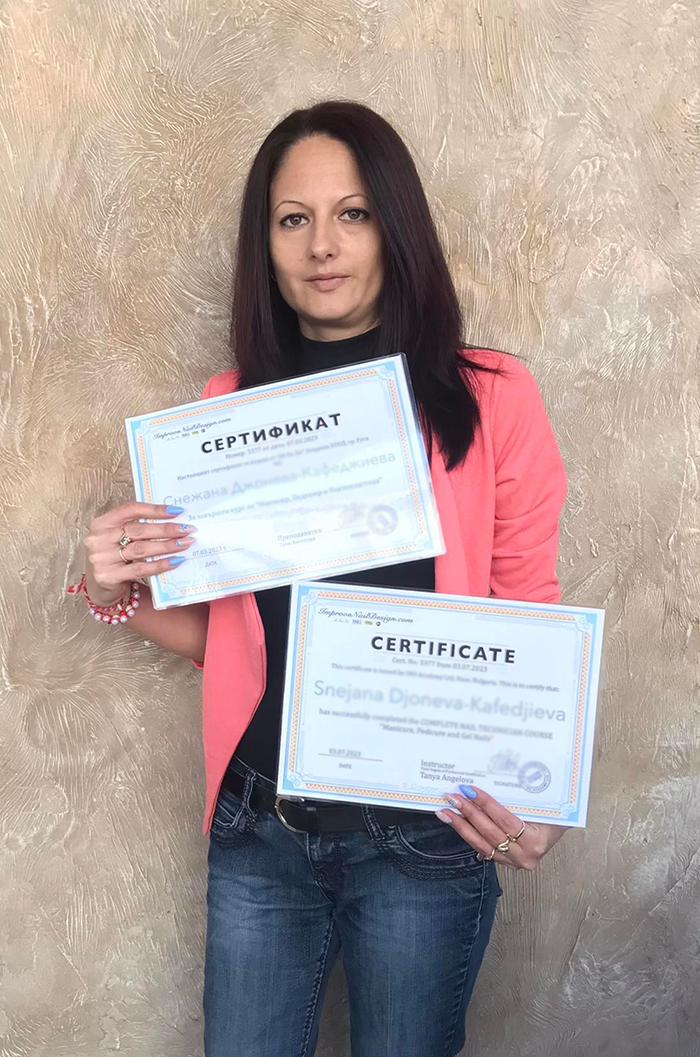 Таня Ангелова е маникюрист и се занимава професионално с това от 2007 година. Обучава по ЕВРОПРОЕКТИ деца в неравностойно положение, които искат да научат повече за професията Маникюрист-Педикюрист, както и други проекти свързани с дейността.