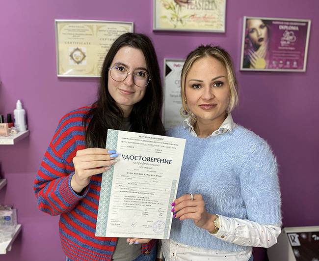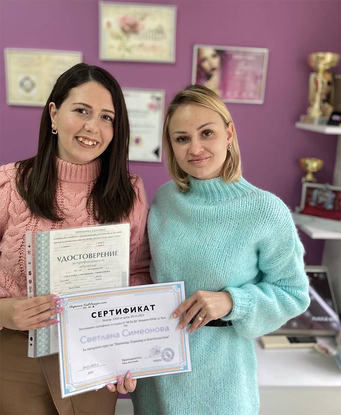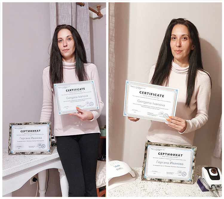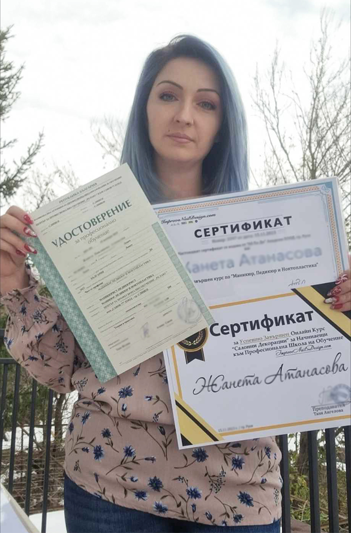 СЛЕД ЗАВЪРШВАНЕ НА ОБУЧЕНИЕТО, НА КУРСИСТА СЕ ИЗДАВАТ УДОСТОВЕРИТЕЛНИ ДОКУМЕНТИ, ПОСОЧЕНИ В ЗАЯВЛЕНИЕТО ЗА УЧАСТИЕ В КУРСА, ПО ДОГОВОР ЗА СЪТРУДНИЧЕСТВО С ЛИЦЕНЗИРАН ЦПО, СЛЕД УСПЕШНО ПРИЛОЖЕН ТЕОРЕТИЧЕН И ПРАКТИЧЕСКИ ИЗПИТ, ЩЕ ТИ ДАДЕ ЗАКОННОТО ПРАВО ДА РАБОТИШ ПРОФЕСИЯТА МАНИКЮРИСТ-ПЕДИКЮРИСТ.
